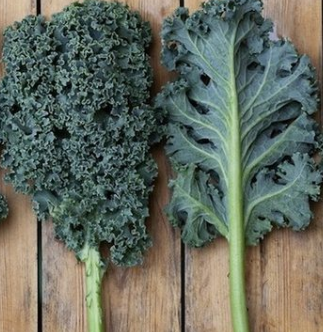 A couve kale tem uma coloração verde-escura (assim como a couve manteiga) mas possui folhagens crespas em vez de lisas.